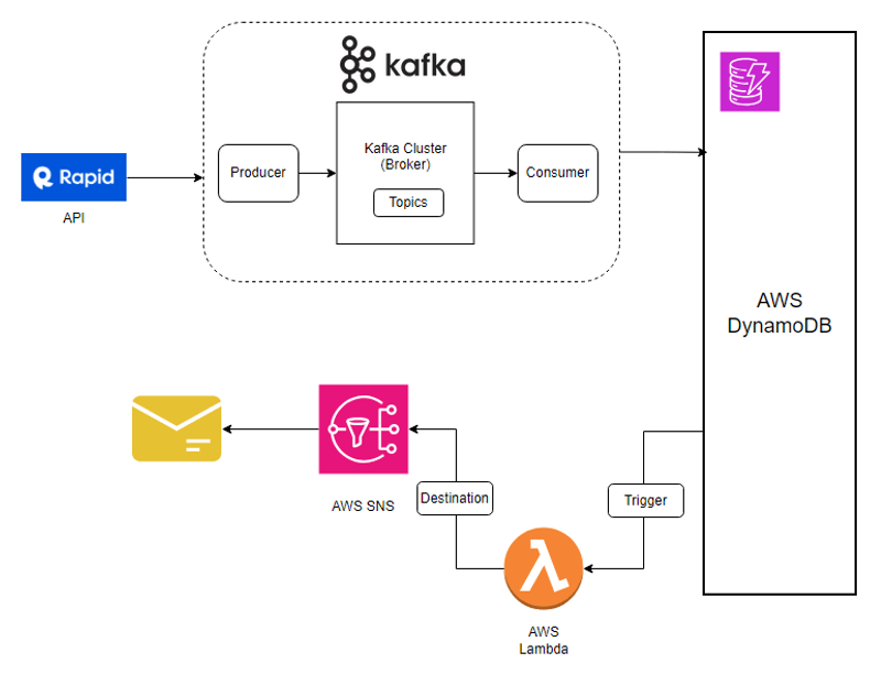 This project aims to develop a robust and scalable pipeline that ingests live stock quotes, processes them, and provides actionable insights using AWS, Kafka, DynamoDB, and SNS, delivering real-time stock quotes to analysts and decision-makers.