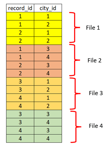 In the same mentioned dataset, in the case of Z-ordering, the data layout will be in the format shown below. With this, city_id = 2 will be read by reading two files, and record_id = 2 will also be read from two files. This is very useful when dealing with large datasets.