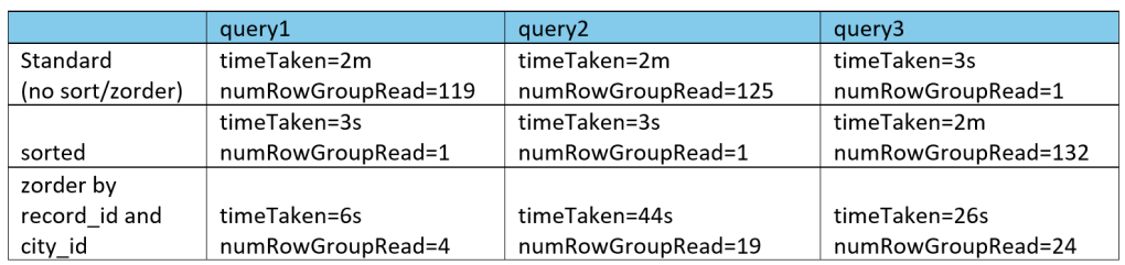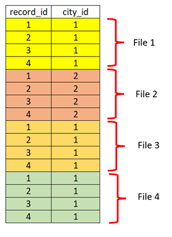 Below is the sample dataset which is sorted by city id and record id. Query the table based on city_id = 2; then only one file will be read. But what if I want to query by record_id = 2? Then it will read all the files and will not be able to do data skipping.