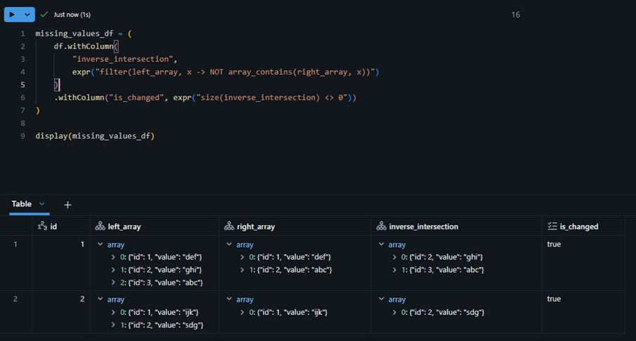 The example below compares two array-of-struct fields and identifies the items that exist in one array but not in the other. Since each item is a struct, the comparison checks the entire struct object on both sides.