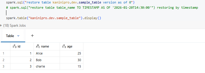 Before we explore and experiment further, it’s important to understand that Delta Lake inherently maintains a complete history of table changes. This history enables powerful features such as time travel, which allows querying data from a specific version or timestamp, and restore, which makes it possible to revert a table back to a previous state. Let’s take a brief look at these capabilities.