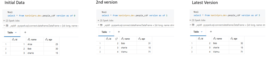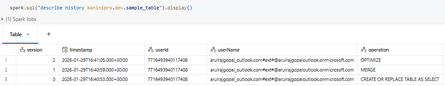 Note: Even though there is one create and one update, there are a total of three versions. The third version is created by OPTIMIZE, which Databricks runs for performance improvement. There is no data change involved. This will be discussed in upcoming articles.