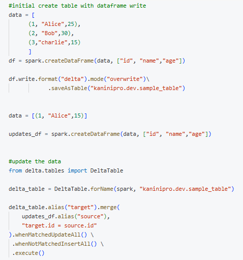 Pyspark code to create a table and update the data.