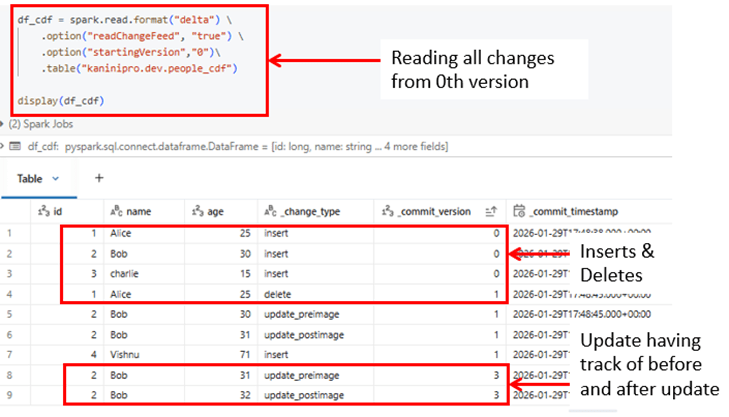 It captures row-level changes from a specified version and identifies whether each change is an insert, update, or delete along with commit version and committed timestamp. As shown in the sample table, updates across versions can be combined and read together by enabling CDF.