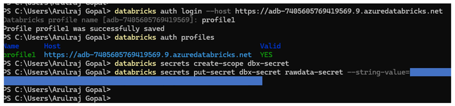 | databricks secrets create-scope <scope-name> databricks secrets put-secret <scope-name> <secret-key-name> –string-value=<secret-value> |