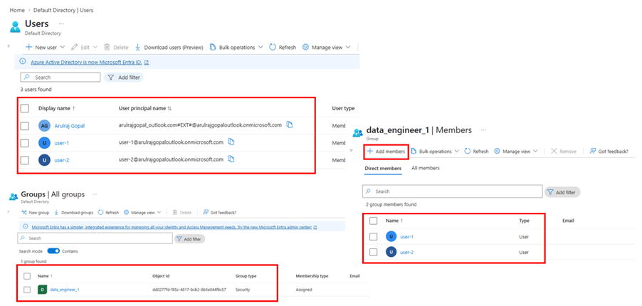 The below users and groups created in Microsoft Entra ID and the users added in the group.