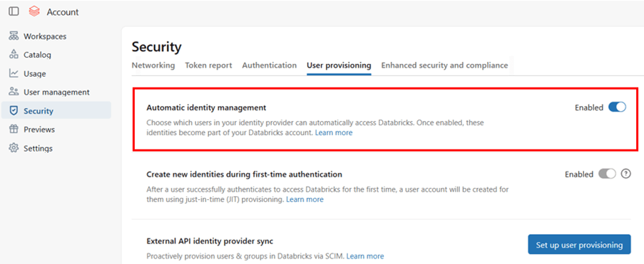 Login Databricks account console – https://accounts.azuredatabricks.net/ and enable Automatic identity management.