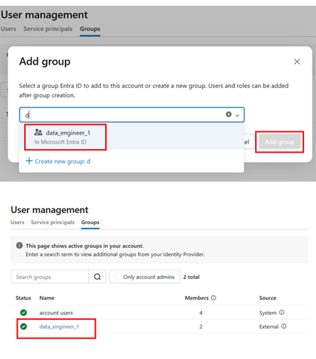 Once Automatic Identity Management is enabled, the Microsoft identities become available and can be synchronized (pulled) into Databricks.