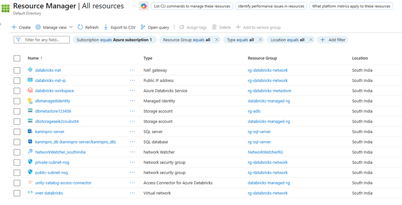 Similar to the NAT Gateway, other managed services are also created alongside it to support various Databricks functionalities. The resources listed below are created together and placed in a separate resource group.