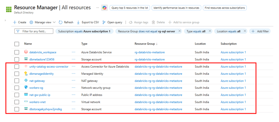 During the creation of an Azure Databricks instance, several other services are also automatically provisioned. It is not recommended to use these resources directly because they are managed by Azure Databricks and serve specific internal purposes.