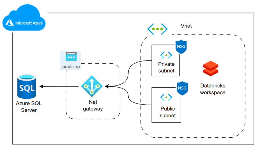 The above diagram illustrates the real-time architecture. Azure Databricks is hosted within a virtual network, along with public and private subnets and a network security group. A NAT Gateway, connected to a static public IP, is associated with both subnets. This IP is whitelisted in Azure SQL Database, enabling Databricks to securely read data from the database.